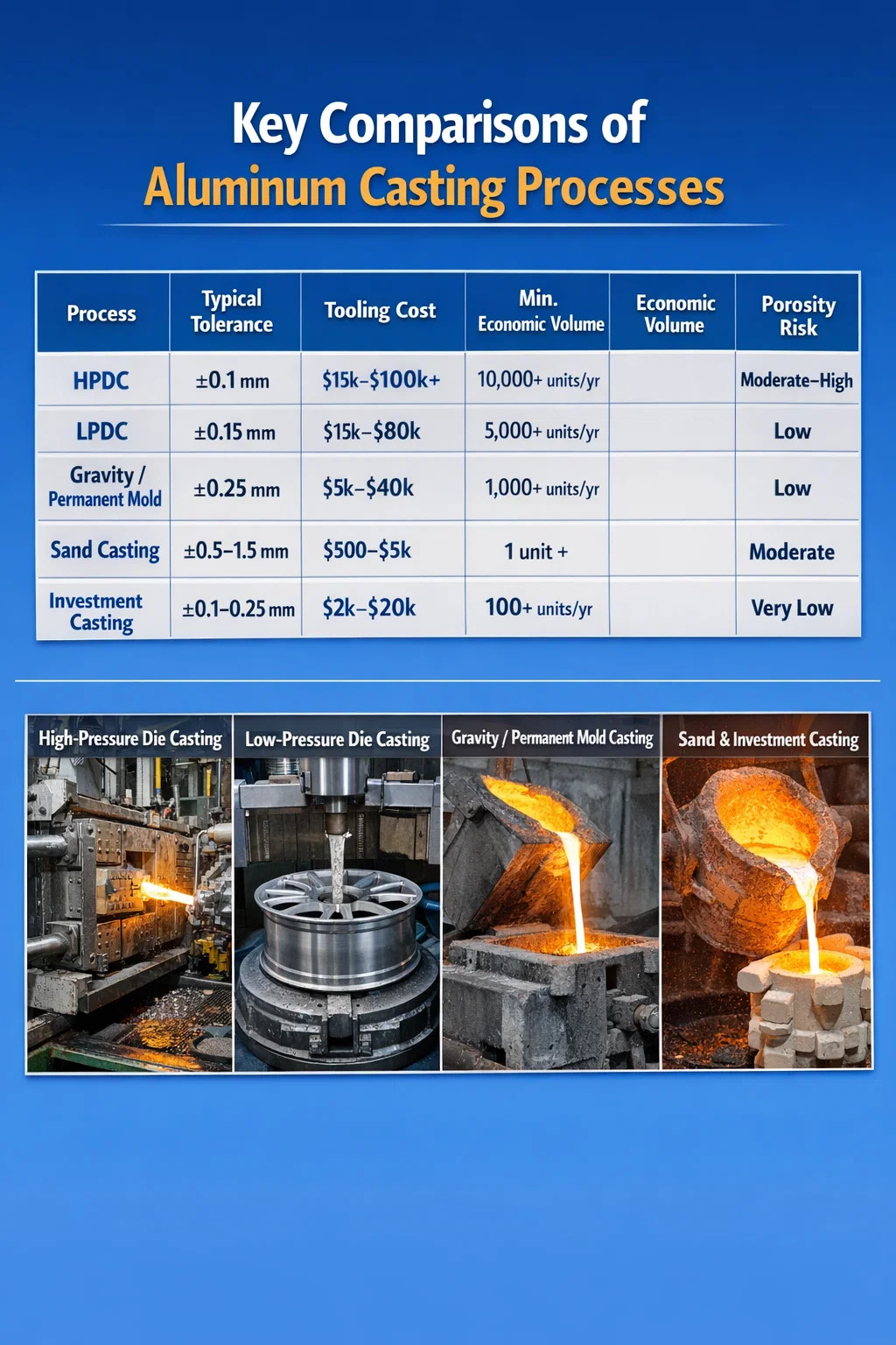 | LPDC | ±0,15 mm | 15.000 USD–80.000 USD | 5.000 de unități/an | Scăzut |