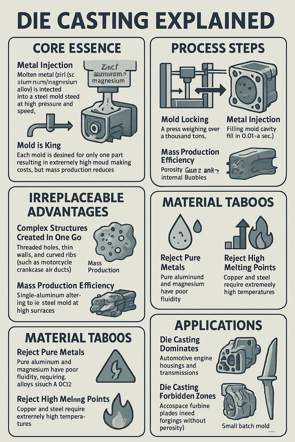 Turnarea prin injecție de metale: metalul topit (zinc/aluminiu/aliaj de magneziu) este injectat într -o matriță de oțel la presiune și viteză ridicată și evacuată după răcire pentru a forma partea.
