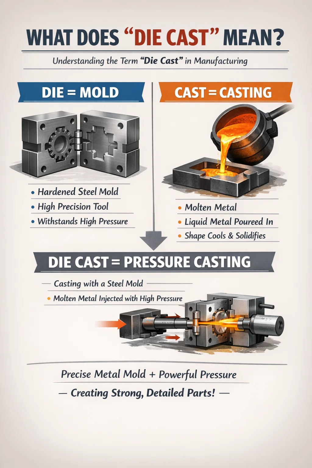 Combinând aceste două cuvinte în „turnare sub presiune”, sensul principal este: turnare sub presiune utilizată o matriță metalică precisă.