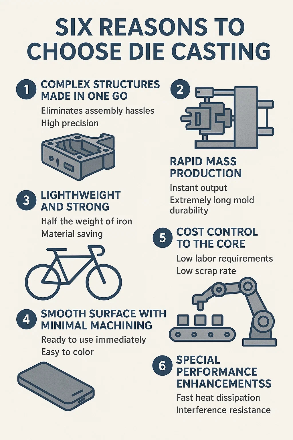 Gata de utilizare imediat: piesele turnate sub presiune au un luciu metalic natural (precum rama unui telefon nou), eliminând nevoia de lustruire.